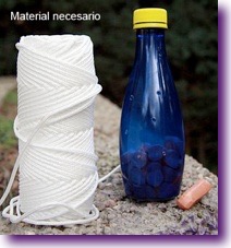 2º.- Una vez controlado el primero y para los más rastreadores, ata una cuerda de unos 15 metros a la misma botella y escóndela, por ejemplo entre unas hojas, a la distancia que te permita la cuerda sin dejarla tensa. Anima a tu perro a la búsqueda y tira un poco de la cuerda si ves que se despista para ayudarle.